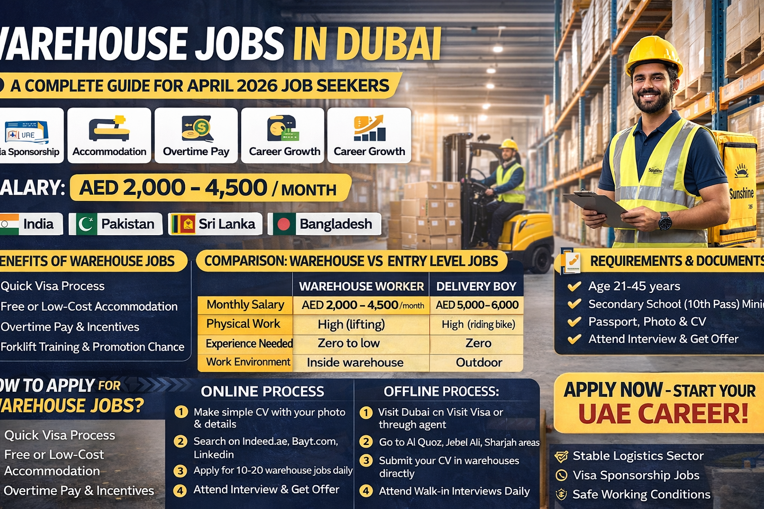 | Monthly Salary | AED 1,800 – 2,500 | Steady income with overtime option |
