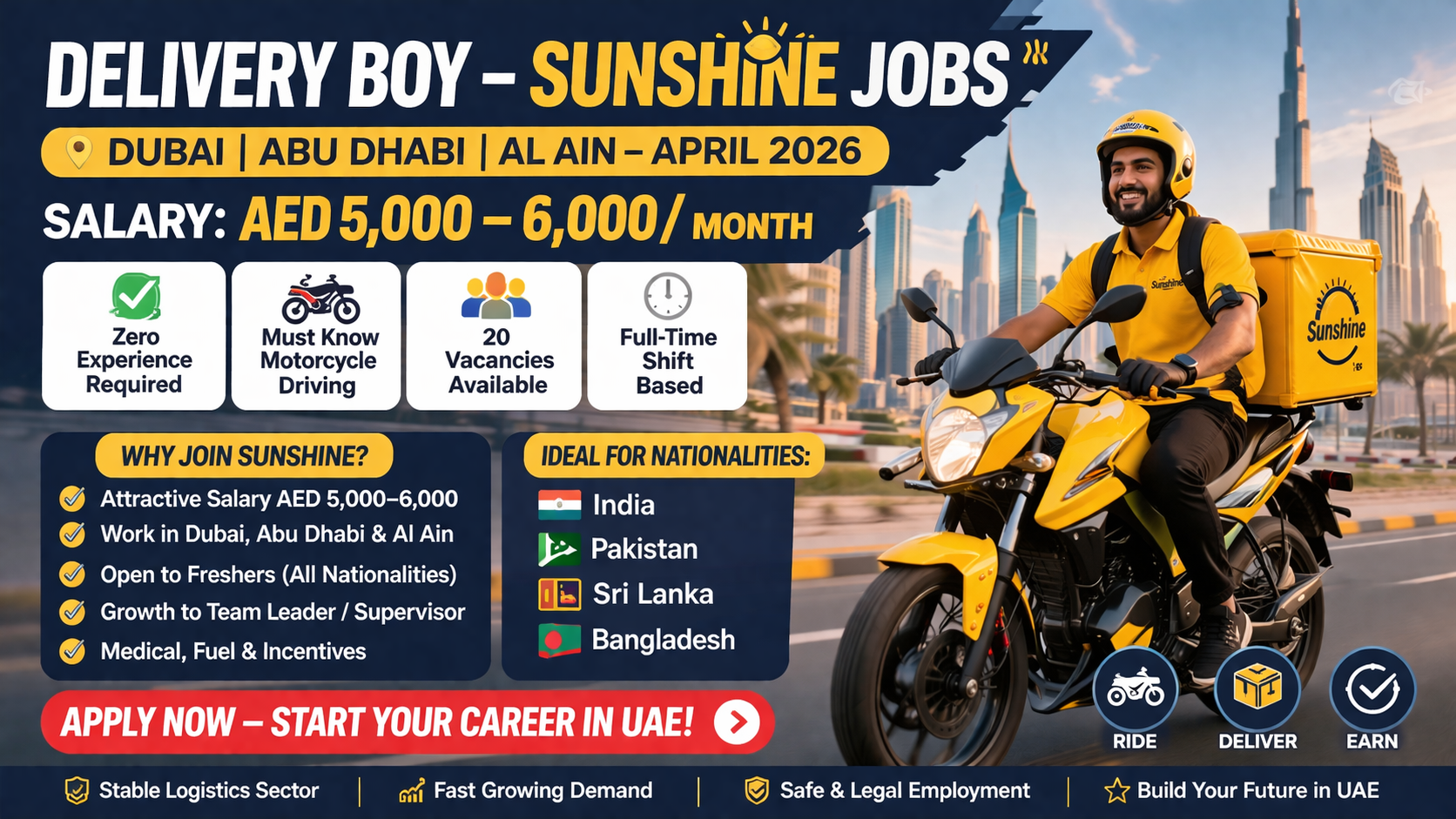 The Dubai, Abu Dhabi and Al Ain job market in April 2026 is going through noticeable changes because of the current situation. While some sectors are hiring slowly, the logistics and delivery sector remains very active. People still need daily essentials, food, documents and parcels delivered quickly and reliably. One strong opportunity available right now is the Delivery Boy or Delivery Agent position at Sunshine with multiple vacancies. This full time job offers a good monthly salary of AED 5,000 to 6,000 and is open to freshers with zero experience. If you are from India, Pakistan, Sri Lanka or Bangladesh and know how to drive a motorcycle then this role is perfect for you and can be your quick entry into the UAE job market.